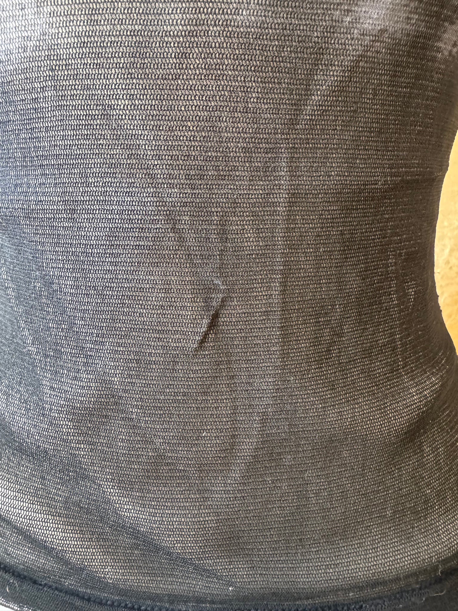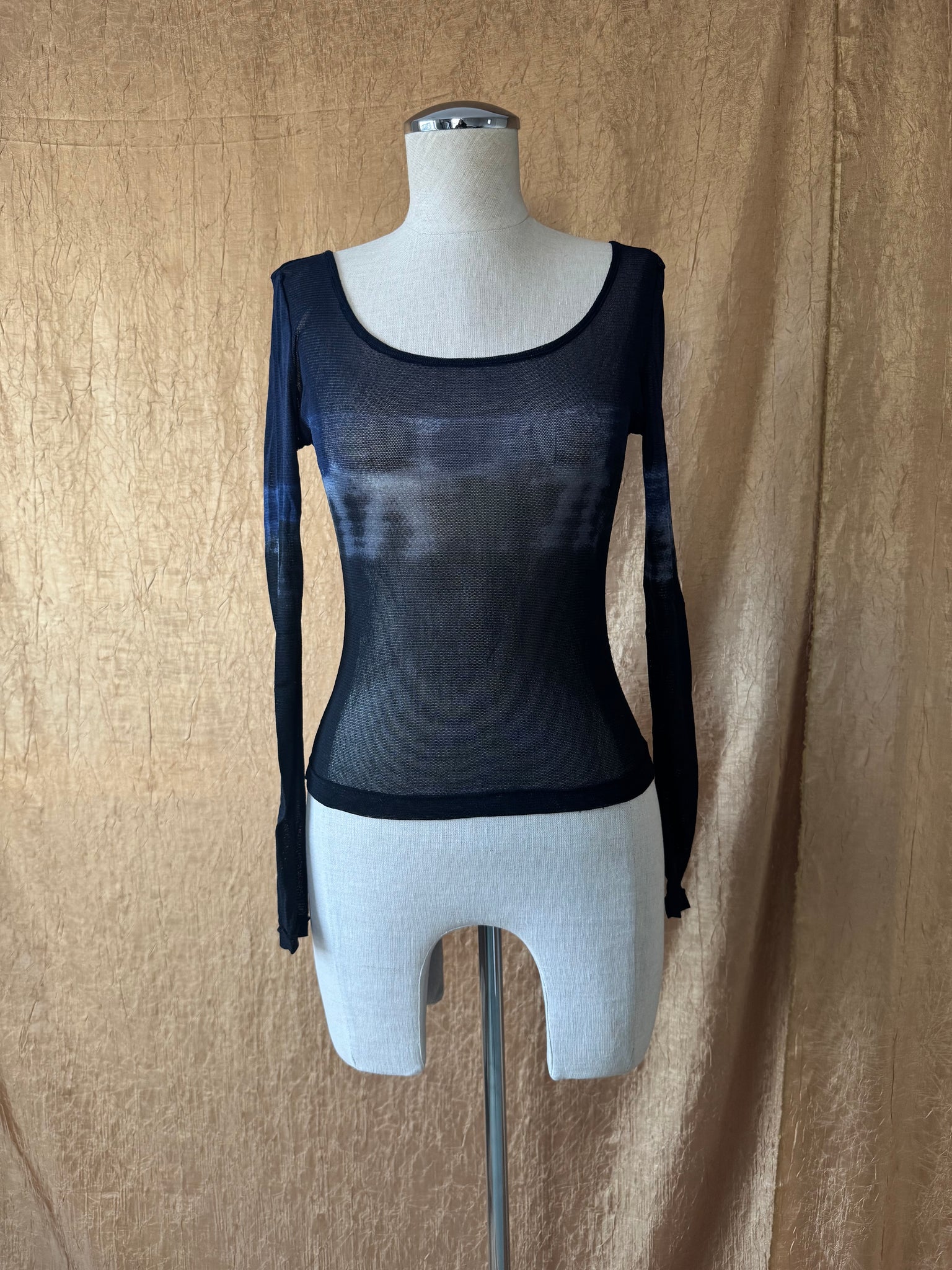 1990’s Vivienne Tam mesh top. Navy with white and blue tie dye.