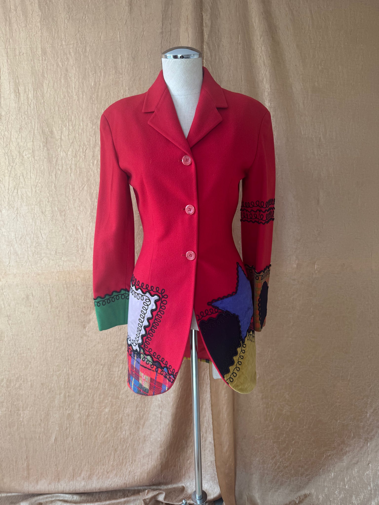 Playful 1990s Complice fitted wool blazer with colorful patchwork appliqué and contrast stitching. Features hearts, stars, plaid, and quilted panels in a sculpted silhouette. Fully lined, made in Italy.