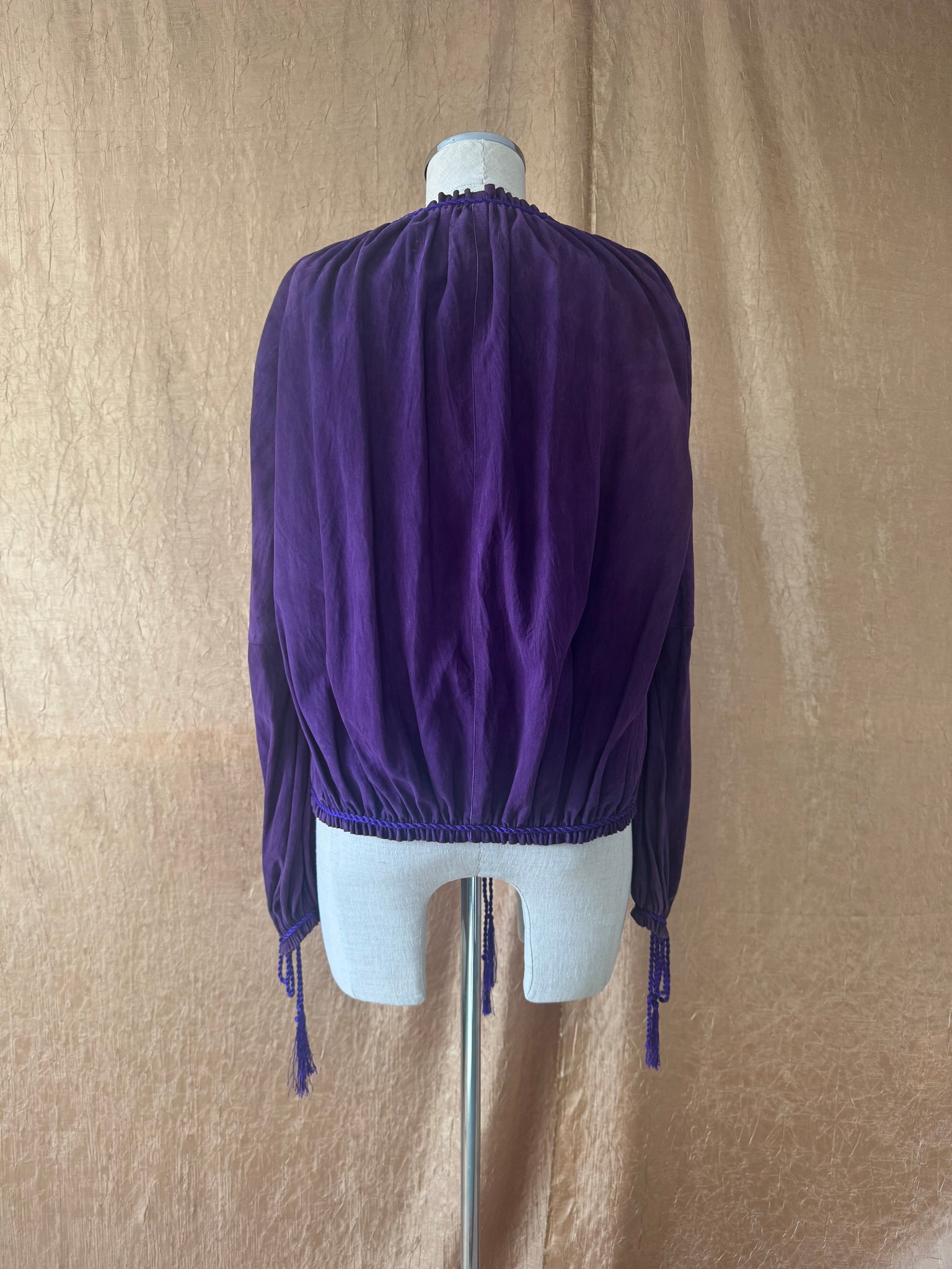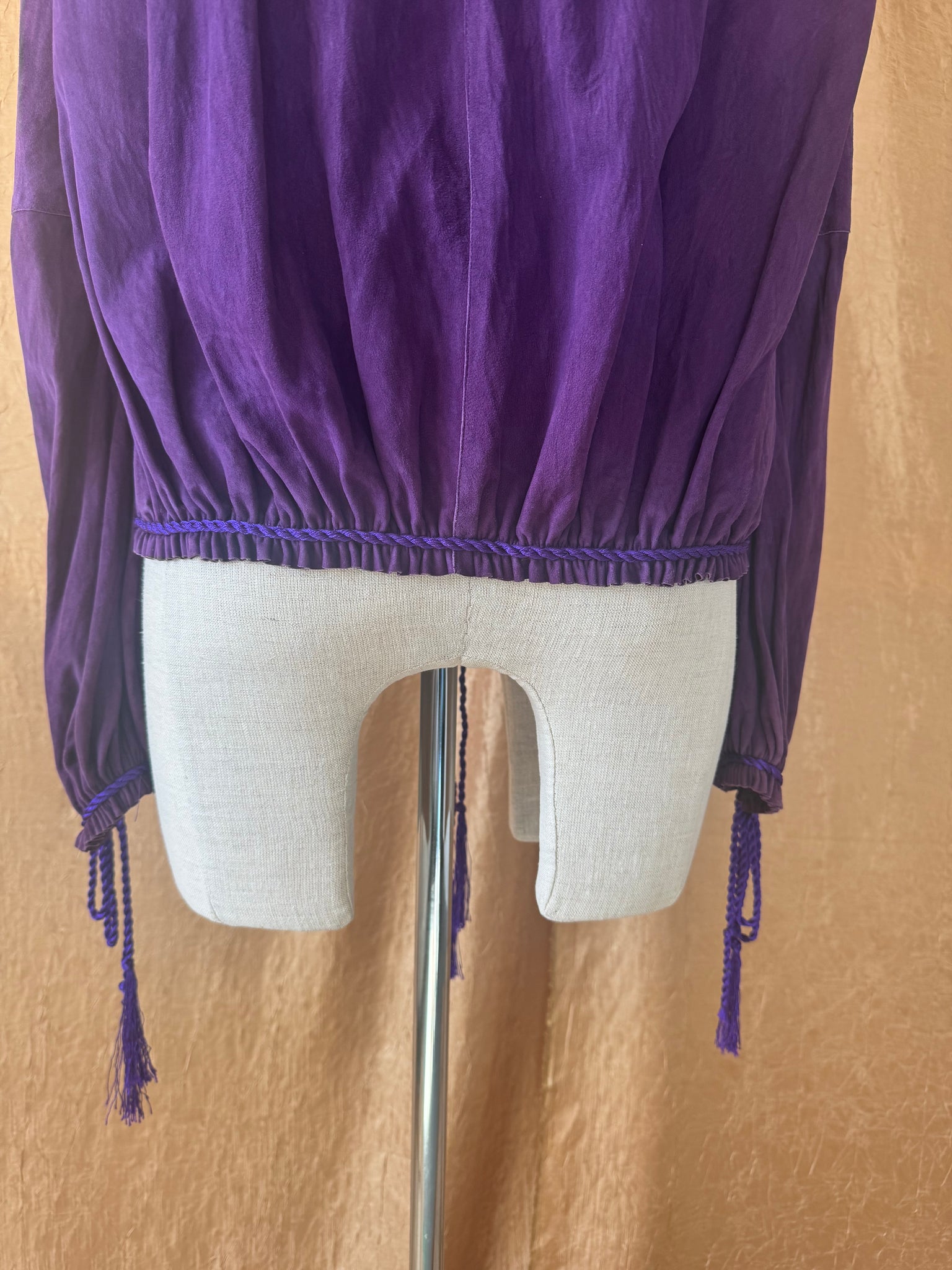 Y2K Ungaro blouse in soft violet suede. Features braided tassel ties at the neck, waist, and cuffs, two front pockets. Made in Italy.
