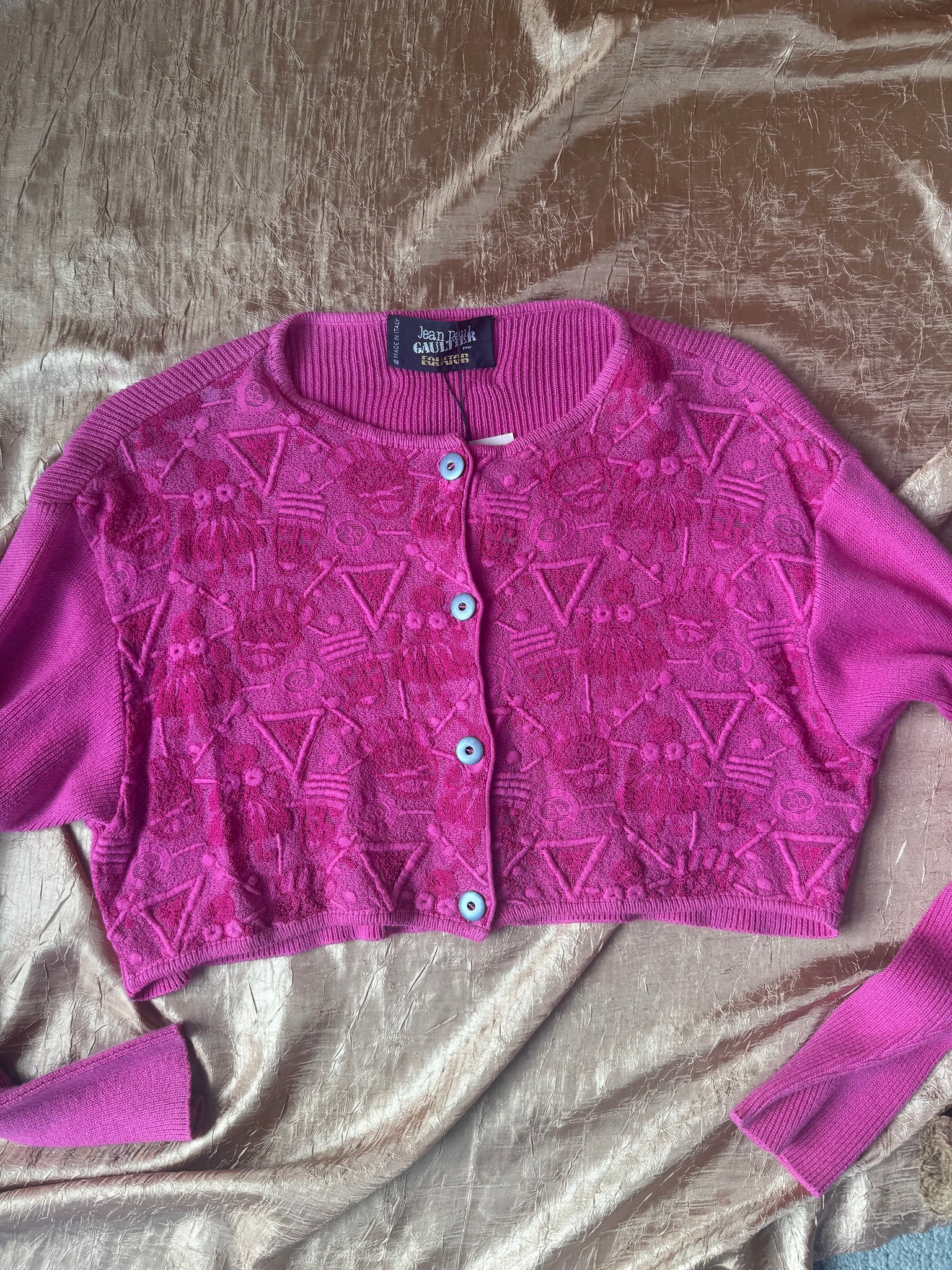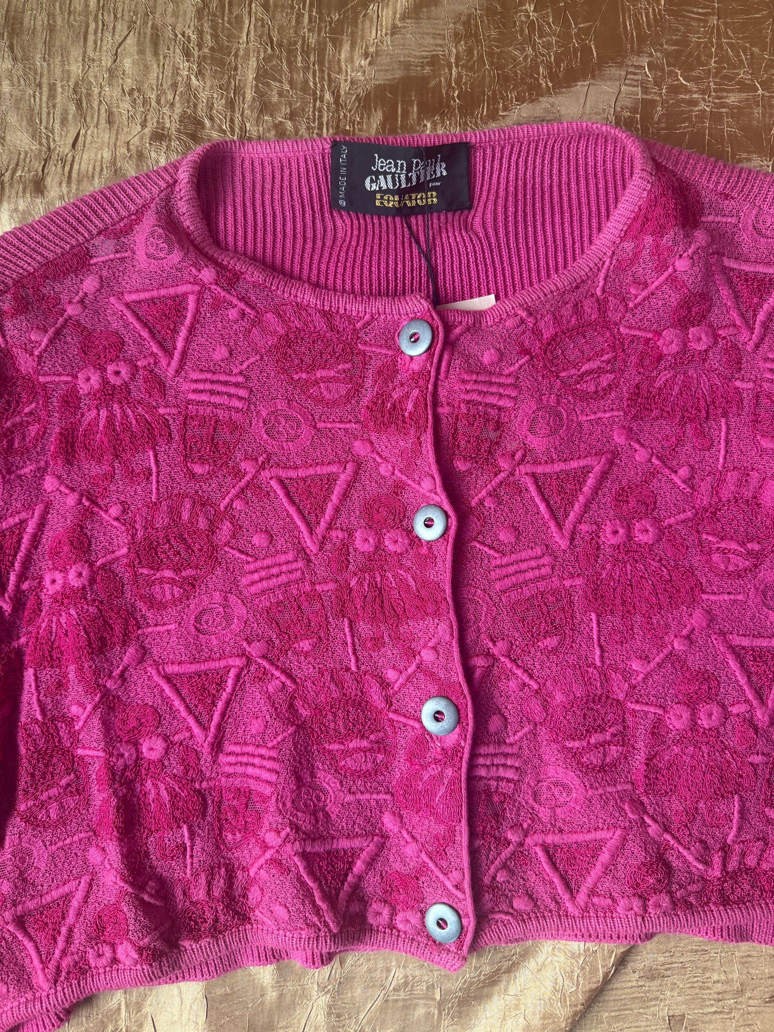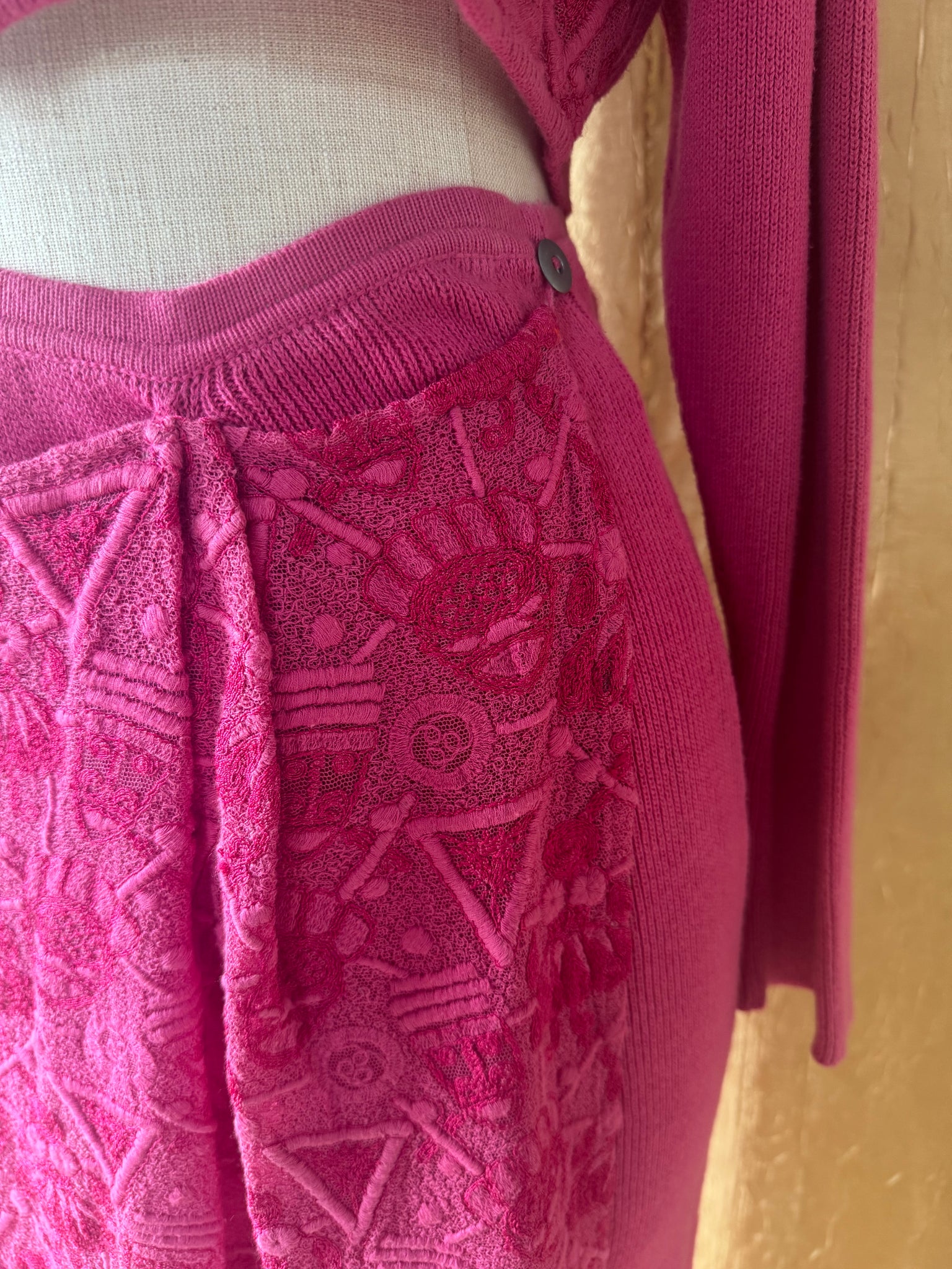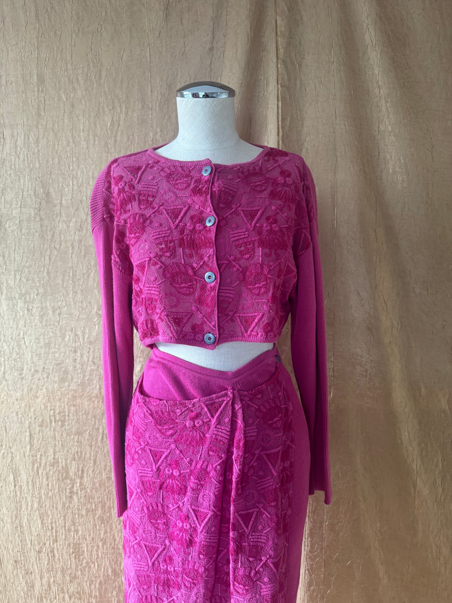 Rare late-80s Jean Paul Gaultier Equator two-piece knit set featuring raised hula dancer and geometric motifs in vibrant fuchsia. Includes a cropped button-front cardigan and matching high-waisted midi skirt with wrap-style panel.