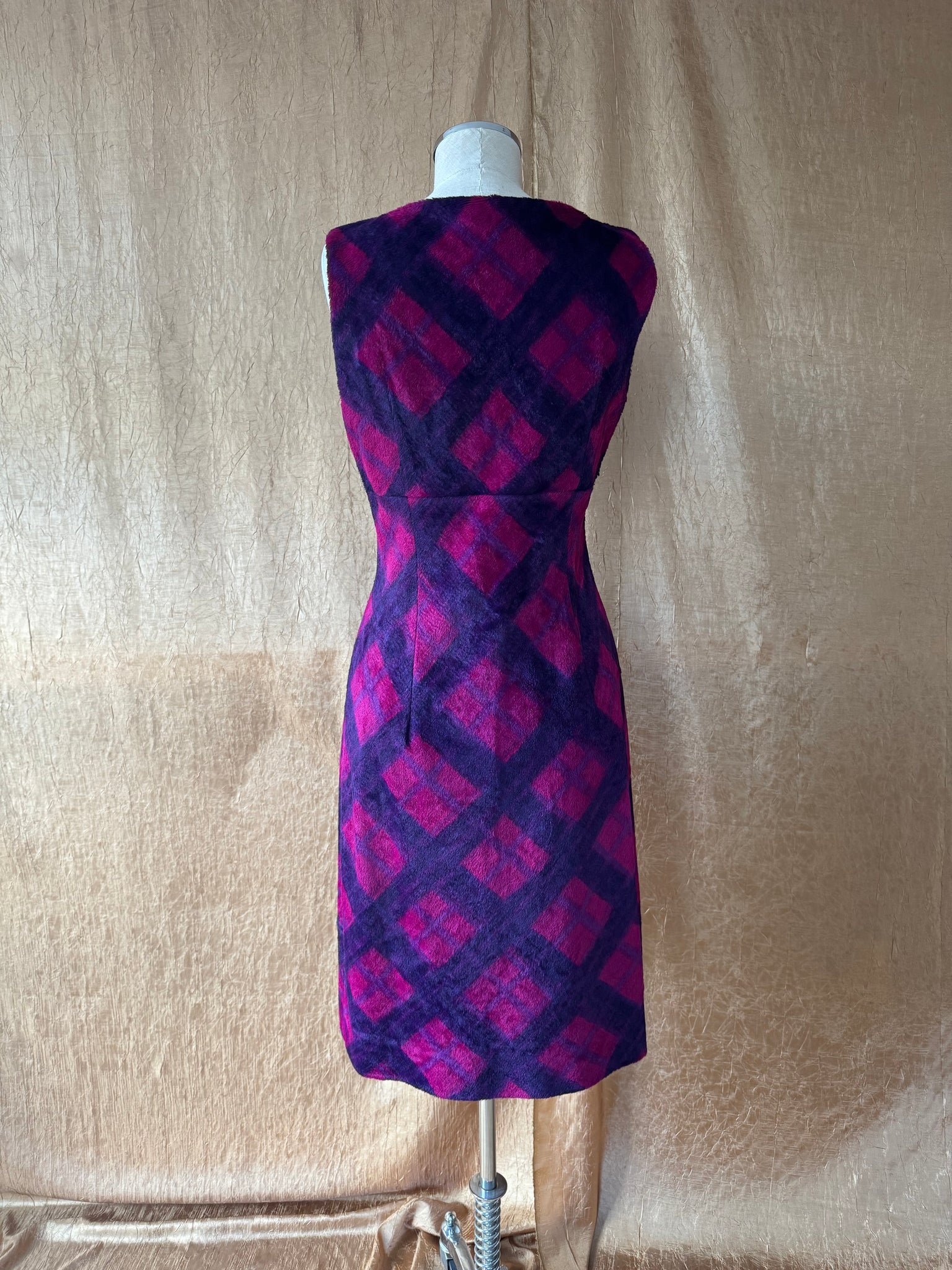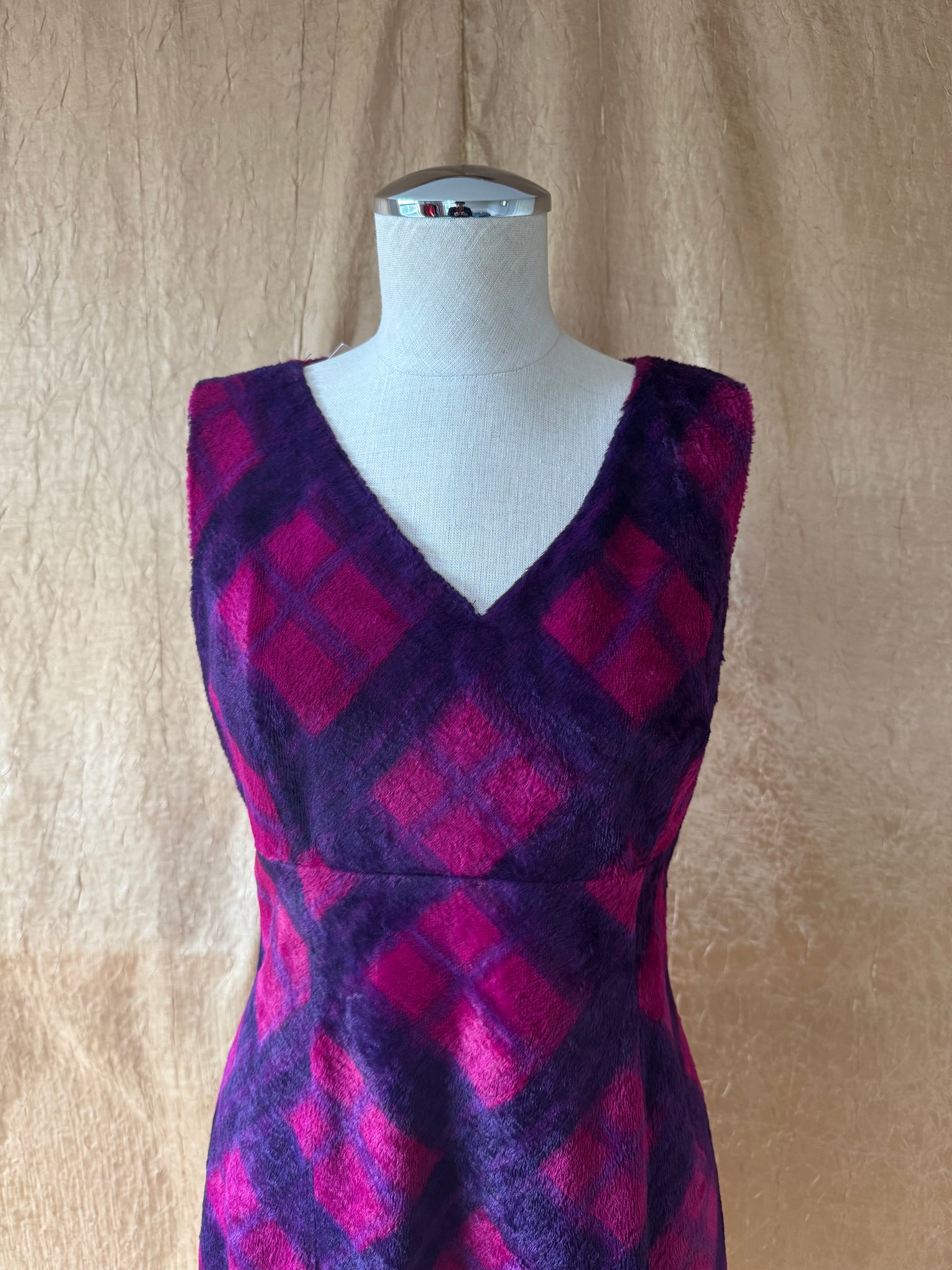 Philosophy di Alberta Ferretti dress in vivid fuchsia and violet plaid with a plush faux-fur texture. Fitted silhouette with a V-neckline, side zip, and full lining. Made in Italy.