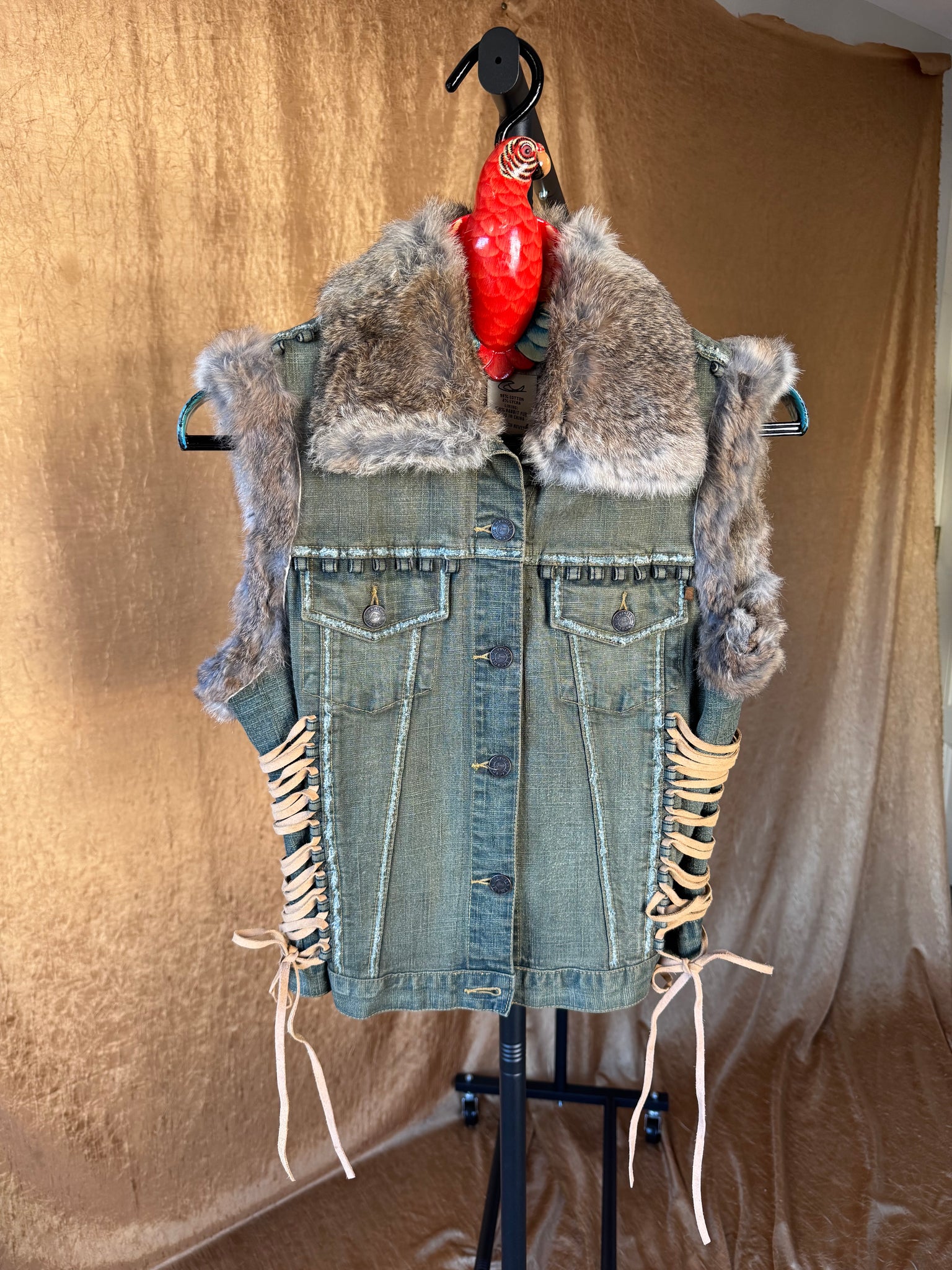 Y2K Christian Lacroix denim vest trimmed in 100% rabbit fur with full fur lining. Features corset-style suede lace-ups down both sides, distressed seaming, and signature Lacroix buttons.