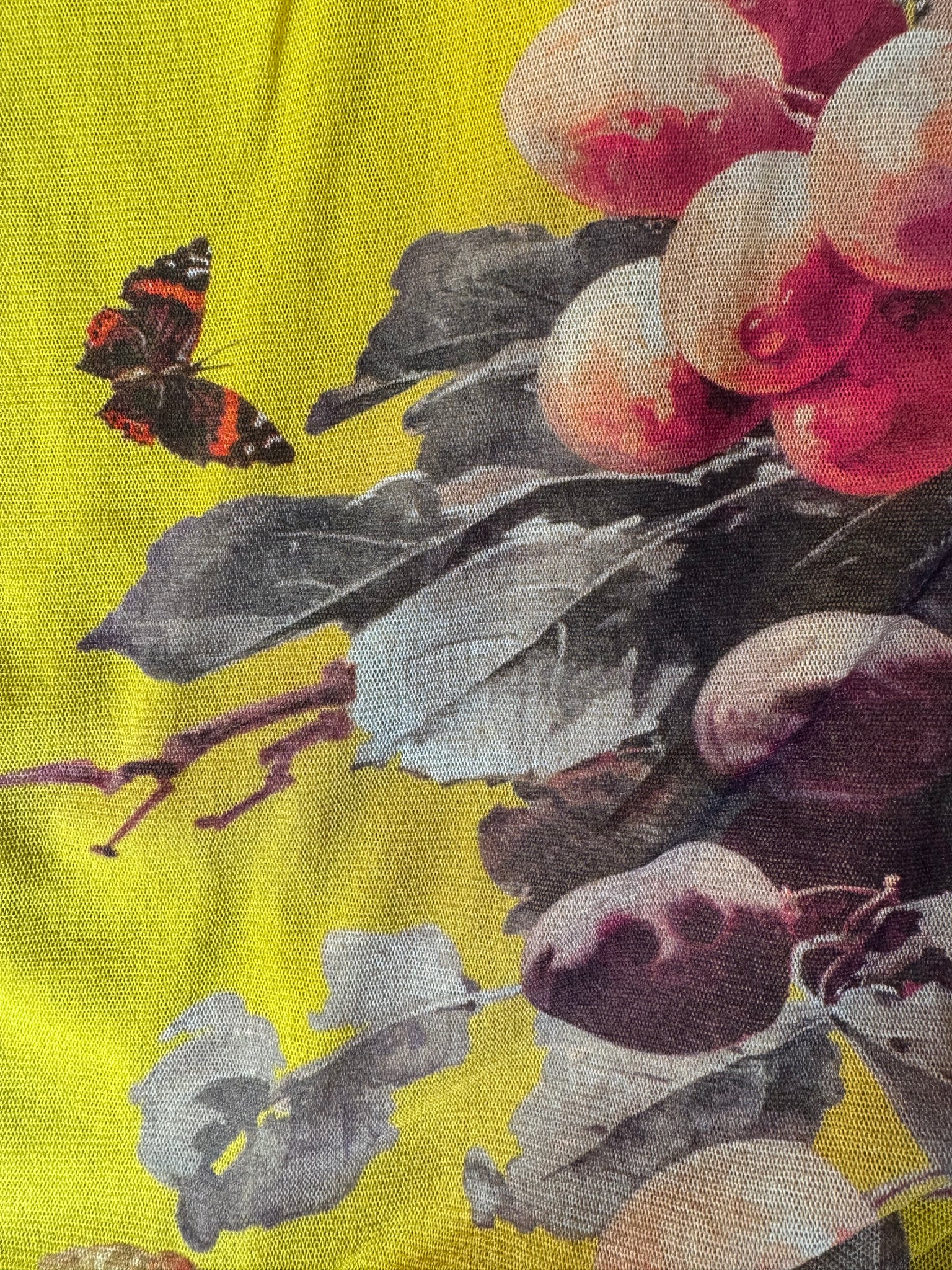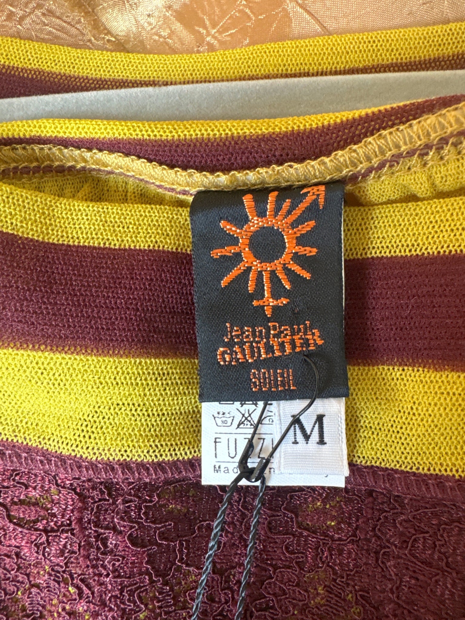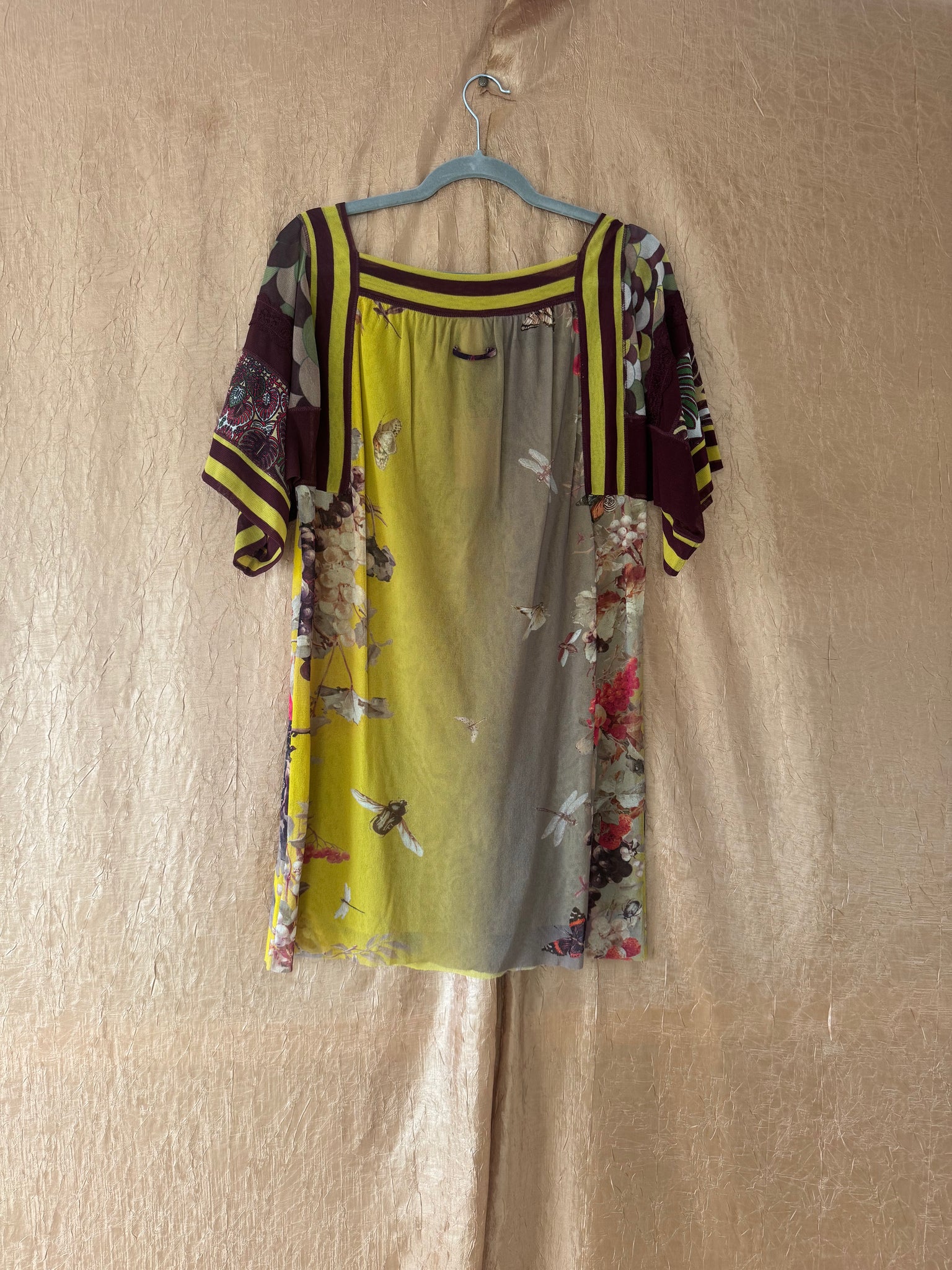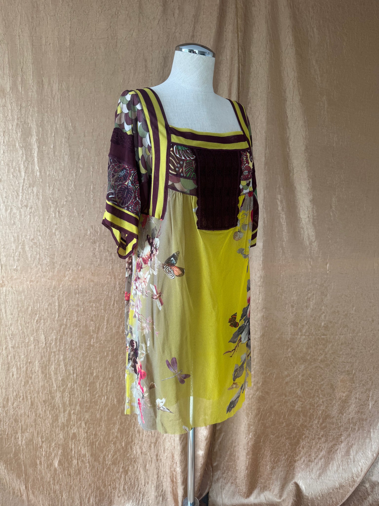 Jean Paul Gaultier Soleil dress circa 2000s. Features multicolor patchwork print with insects florals, and striped trim.